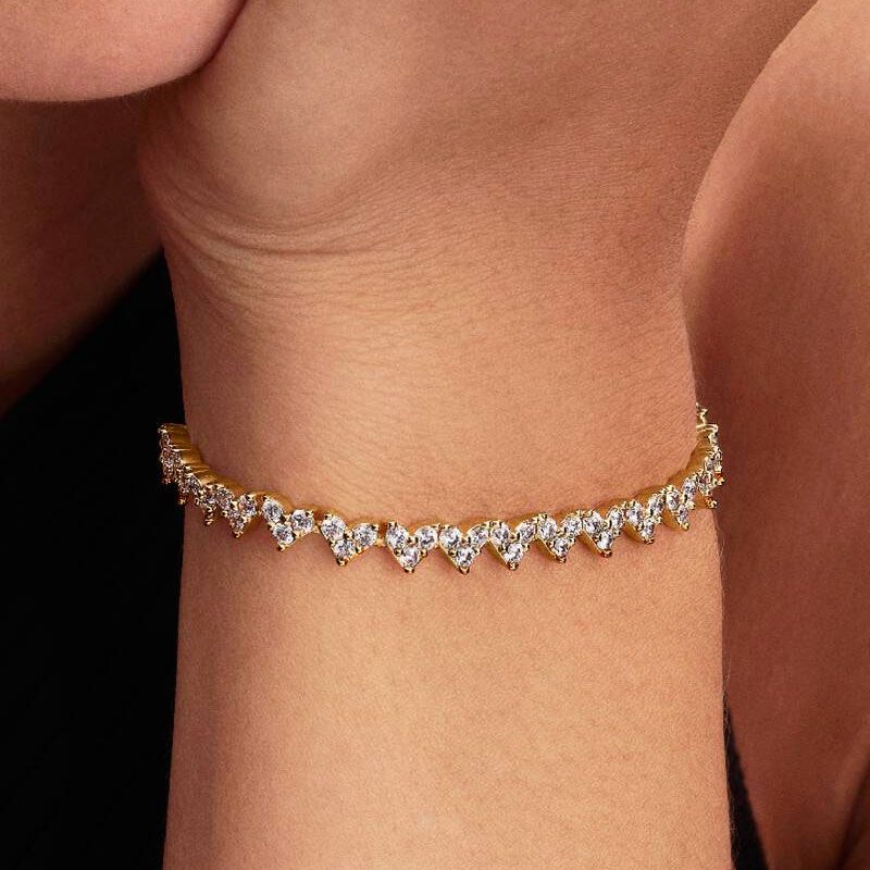 Laissez-vous séduire par l'élégance minimaliste du bracelet Pandora Cœurs Trios de Pierres, une pièce délicate conçue pour illuminer votre poignet avec une finesse absolue. Ce bijou se distingue par sa structure en métal de haute qualité, sublimée par une dorure à l'or 14 carats (585/1000e) pour un éclat solaire et durable.