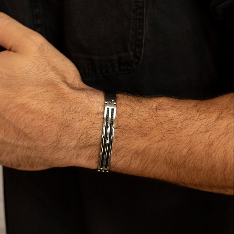 L'excellence artisanale de ce bracelet se révèle dans la précision exceptionnelle de sa réalisation, où la structure en acier inoxydable encadre parfaitement les doubles câbles noirs pour créer un jeu de matières et de textures fascinant. Ses dimensions de 55x65 mm garantissent une présence affirmée au poignet, tandis que le système de fermeture articulé assure un confort optimal et une sécurité maximale au quotidien. Cette pièce polyvalente s'harmonise parfaitement avec les codes vestimentaires contemporains, apportant une touche de modernité industrielle qui sublime aussi bien une tenue décontractée qu'un look plus sophistiqué.