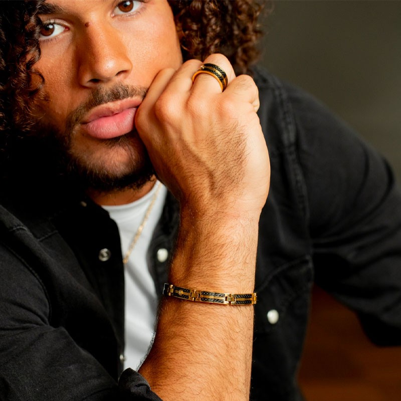 L'excellence artisanale de ce bracelet se révèle dans la précision exceptionnelle de son assemblage, où chaque élément doré encadre parfaitement les inserts en fibre de carbone pour créer un rythme visuel captivant. Sa taille ajustable de 19,5 + 1,5 cm s'adapte parfaitement à tous les poignets, tandis que la structure articulée garantit un confort optimal et une fluidité de mouvement remarquable au quotidien. Cette pièce polyvalente s'harmonise parfaitement avec les codes vestimentaires actuels, apportant une touche de luxe sportif qui sublime aussi bien une tenue casual qu'un look plus sophistiqué.