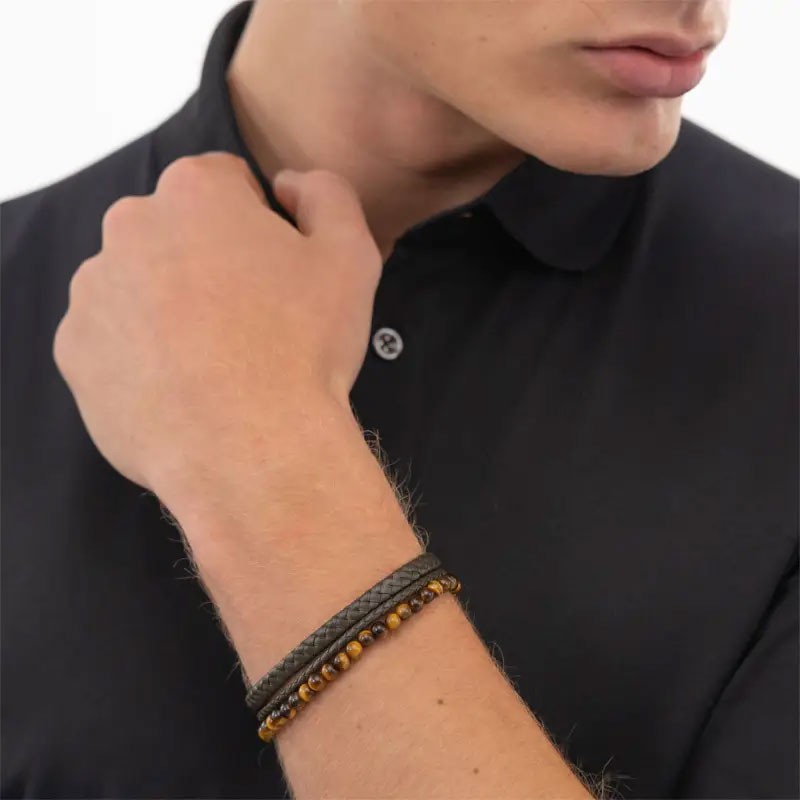 Ce modèle associe des brins de cuir tressé d'un brun profond et chaleureux, à l'intensité vibrante des perles d'œil-de-tigre. Cette pierre, célèbre pour ses reflets chatoyants et ses nuances d'or et de marron, apporte une touche d'énergie et d'originalité. L'ensemble est magnifié par une attache rectangulaire en acier doré, à la finition polie et brillante, qui allie solidité et raffinement.
