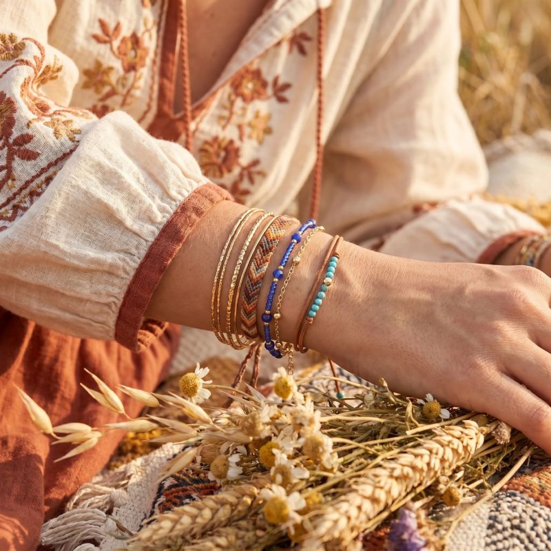 Le design de ce bracelet repose sur une harmonie parfaite entre matières et géométrie. Son tissage délicat assemble des perles et des cristaux de verre d'un bleu royal intense, dont les reflets captent la lumière avec une grâce infinie. L'originalité du modèle réside dans ses mailles rondes dorées — de petites billes de métal poli — qui rythment le rang perlé et lui confèrent une allure intemporelle. Sa structure double, combinant le fil de perles et une fine chaîne dorée, apporte une touche de sophistication moderne à votre poignet.