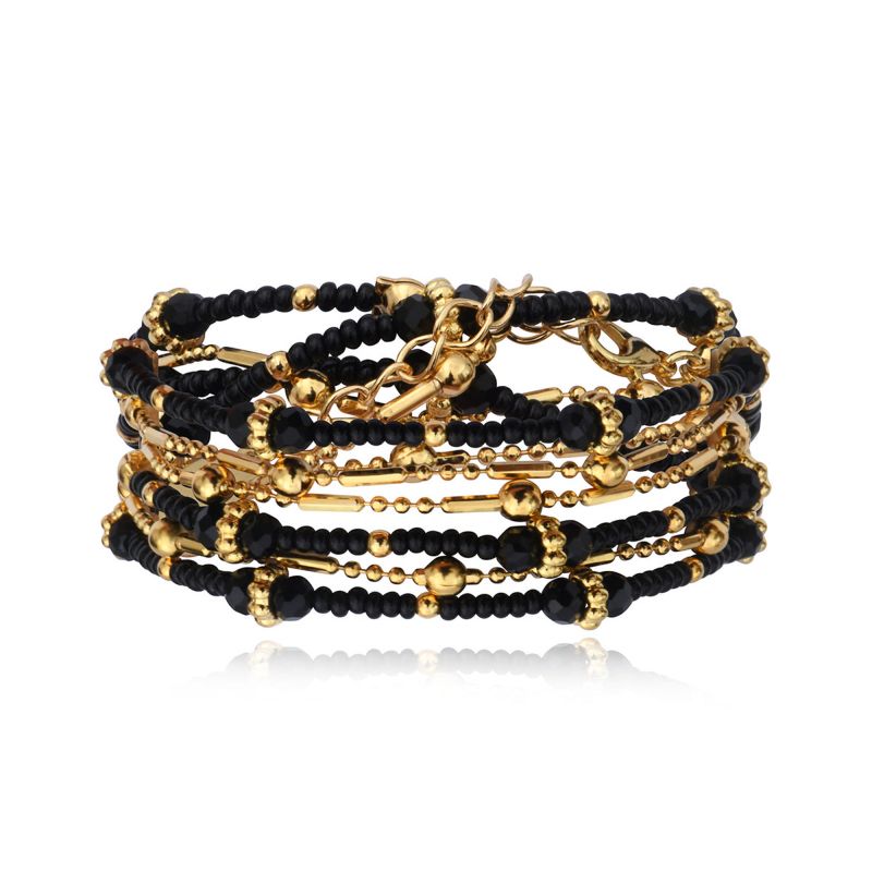 Le véritable secret de cette pièce réside dans sa modularité : selon vos envies, elle se porte en bracelet trois tours pour un effet de manchette sophistiquée, ou en collier rayonnant pour illuminer votre décolleté. Son design repose sur un tissage complexe et minutieux de perles et de cristaux de verre noirs, alternant avec rythme des mailles en boules, des tubes allongés et des perles rondes. L'ensemble est sublimé par de délicates "couronnes" dorées qui captent la lumière avec noblesse à chaque mouvement.