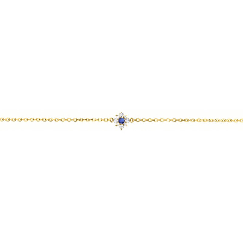 Ce modèle est réalisé en plaqué or, assurant une base durable et une couleur chaleureuse qui sublime les pierres. La chaîne fine est centrée par un délicat motif de fleur. Au cœur de ce motif se trouve un oxyde de zirconium d'un bleu saphir profond, entouré de huit petits oxydes blancs et scintillants qui forment les pétales. L'ensemble des neuf oxydes crée un point focal lumineux et raffiné.