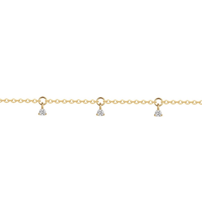 Ce modèle est réalisé en plaqué or, assurant une base durable et une couleur chaleureuse. La chaîne fine et délicate est ponctuée de cinq petits anneaux d'où pendent de fines pampilles. Chacune de ces pampilles est ornée d'oxydes de zirconium scintillants, qui captent la lumière avec finesse et dansent au gré de vos mouvements, créant un effet de cascade lumineuse.
