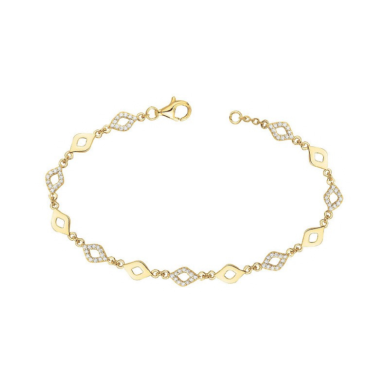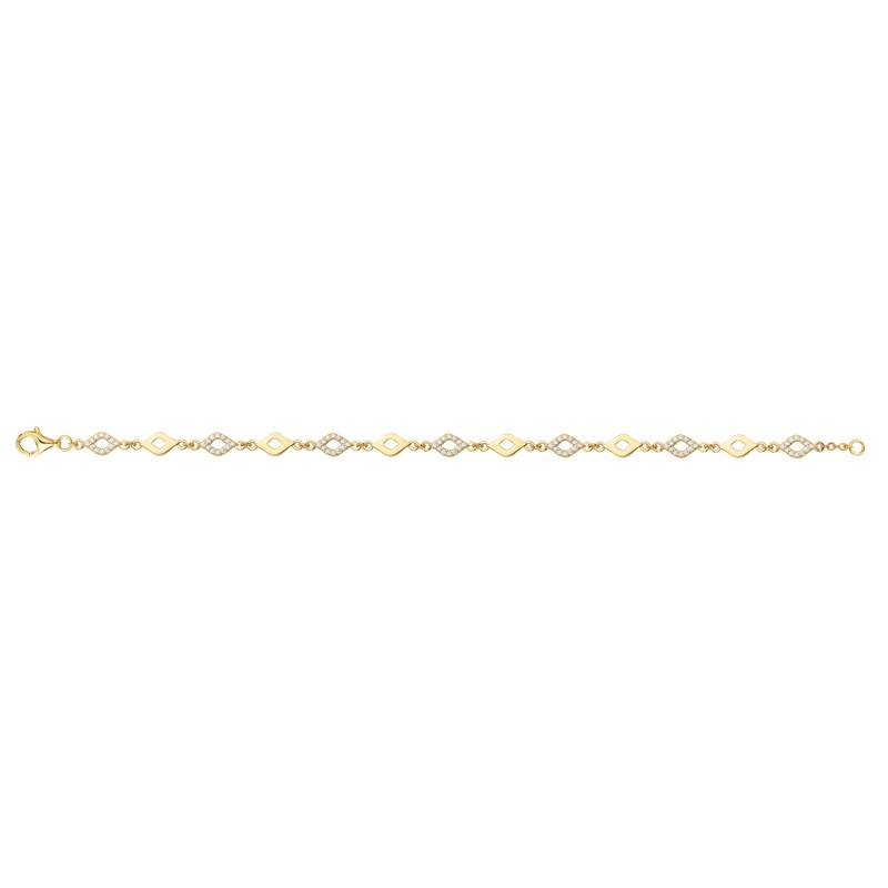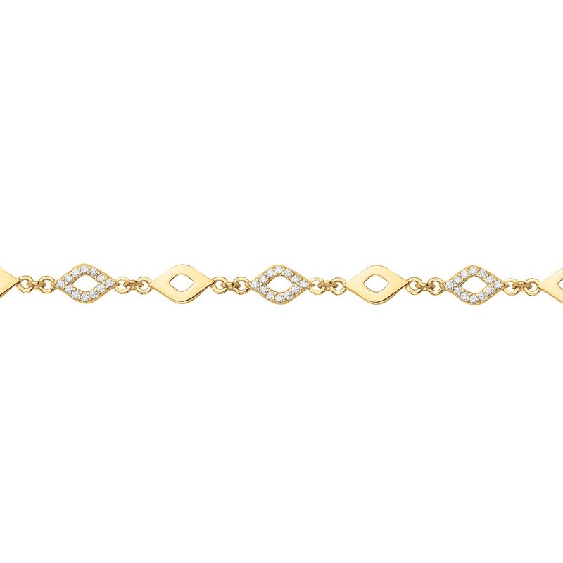 Ce modèle est réalisé en plaqué or, assurant une base durable et une couleur chaleureuse. Le bracelet est construit d'une série de maillons en forme de losanges horizontaux. Ces motifs alternent entre des losanges en métal poli et des losanges finement pavés d'oxydes de zirconium scintillants. Cette alternance crée un rythme visuel captivant et une brillance qui se déploie sur toute la longueur du bracelet.