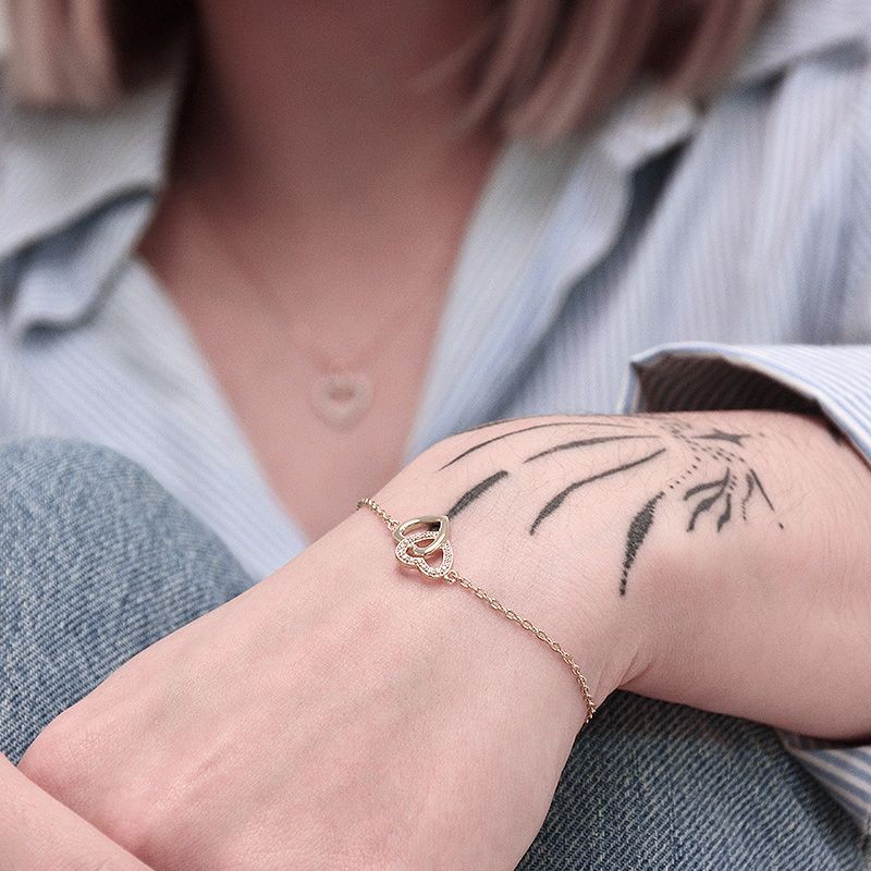 Cette pièce est réalisée en vermeil, c'est-à-dire de l'argent 925 trempé dans l'or 18 carats avec une épaisseur de 5 microns. C'est une vraie alternative à l'Or, offrant un métal précieux et durable. D'un poids de 2,20 grammes, le bracelet est monté sur une chaîne fine et présente un motif central où un des cœurs est lisse et poli, tandis que l'autre est pavé de 18 oxydes de zirconium scintillants, accentuant l'effet de croisement.