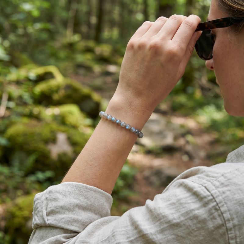 Ce bracelet boules EDORA Collection Terra est orné de perles naturelles de labradorite, une pierre fascinante originaire du Brésil, reconnue pour ses reflets irisés uniques qui captivent le regard. Chaque perle de 6 mm est soigneusement polie, révélant une palette subtile de nuances grises, bleues et vertes qui varient selon la lumière, offrant à ce bijou une élégance naturelle et mystérieuse. La qualité des perles témoigne d’un équilibre parfait entre pureté et authenticité.