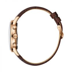 Son boîtier circulaire de 44 mm, en métal poli, s’associe à un bracelet en cuir brun façon croco, alliant confort et style intemporel. La boucle ardillon traditionnelle assure un maintien sûr, affirmant un look classique revisité avec une modernité discrète, idéal pour l’homme qui aime marier tradition et tendances actuelles.
