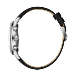 Le boîtier rond de 44 mm, en métal argenté, s’habille d’un verre minéral protecteur pour une robustesse à toute épreuve. Le bracelet en cuir noir façon croco, doux au toucher et naturellement élégant, offre un confort de port exceptionnel tout en affirmant un style sophistiqué et contemporain. La fermeture à boucle ardillon garantit un ajustement précis, complétant ce modèle parfaitement adapté à l’homme urbain et exigeant.
