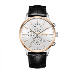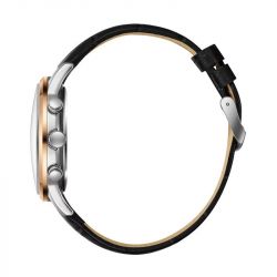 Son boîtier bicolore de 44 mm, en métal poli, associe la chaleur d’une lunette rosegold à la pureté d’un corps argenté, offrant un contraste harmonieux et moderne. Le bracelet en cuir noir façon croco, souple et texturé, vient souligner cette dualité avec sobriété et force, tandis que la boucle ardillon garantit un ajustement parfait, confortable et sûr.