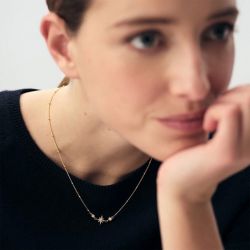 Le pendentif en forme d’étoile sertie d’un oxyde de zirconium central apporte une touche lumineuse et poétique à ce bijou. Cette petite étoile délicate capte la lumière avec éclat, symbolisant la beauté, l’espoir et la singularité de celle qui le porte. Son design minimaliste et élégant se marie parfaitement avec la chaîne fine et légère, qui enveloppe le cou avec grâce.