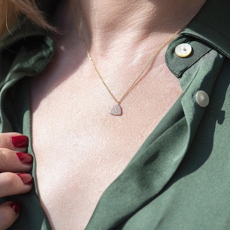 Ce bijou est issu de la collection Eolo, qui est une célébration de l'art moderne mêlé à la richesse des matériaux. La pièce présente une forme triangulaire pavée de diamants, reflétant un design contemporain tout en conservant la douceur et la sophistication de l'or traditionnel.