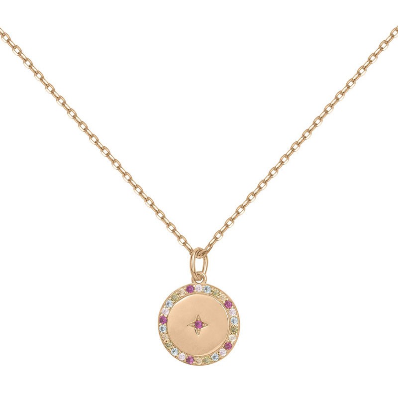 Ce bijou fascine par son équilibre parfait entre symbolisme et esthétisme, où chaque oxyde coloré contribue à créer cette aura précieuse qui transforme le pendentif en véritable objet de contemplation. La chaîne fine en plaqué or de 42+3 cm offre une longueur parfaite qui met délicatement en valeur ce médaillon sans jamais lui faire concurrence, permettant au pendentif d'exprimer pleinement sa personnalité rayonnante. Le fermoir mousqueton assure une sécurité optimale tout en préservant la fluidité naturelle du bijou.