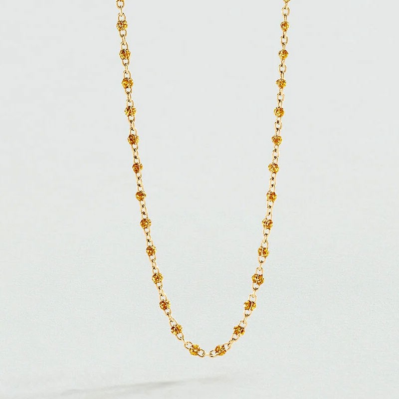 Ce collier est réalisé en acier inoxydable doré à l'or fin, garantissant sa durabilité et son éclat précieux. Les billes d'émail, appliquées avec soin, apportent une note de couleur intense. Le collier a une longueur de 375 mm, complétée par une rallonge de 50 mm pour un ajustement parfait en ras-du-cou. Son poids de 2 grammes le rend très léger et agréable à porter.
