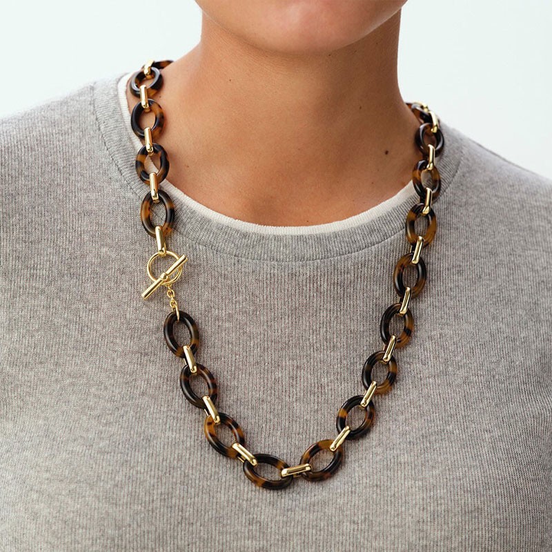 Imaginé à Paris, ce collier maille de la collection ARIA est une pièce audacieuse et élégante. Il se distingue par ses maillons de résine couleur écaille de tortue, qui lui confèrent un look moderne et sophistiqué, parfait pour celles qui aiment les bijoux avec du caractère.