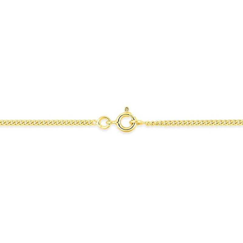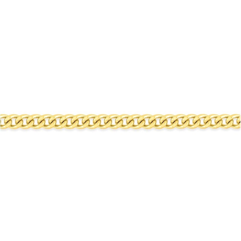 Cette chaîne est réalisée en or jaune 375 millièmes (9 carats), garantissant une qualité précieuse et une teinte dorée riche. Son maillon de type gourmette, d'une largeur affirmée de 1,76 mm, bénéficie d'une finition diamantée. Ce traitement de surface multiplie les reflets, assurant un scintillement continu et spectaculaire. Le poids moyen d'or est de 3,25 g pour une longueur de 40 cm.