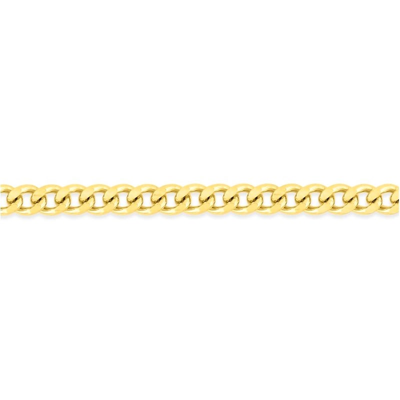 Cette chaîne est réalisée en or jaune 375 millièmes (9 carats), garantissant une qualité précieuse et une teinte dorée riche. Sa maille gourmette, d'une épaisseur notable de 2,10 mm, lui confère une présence substantielle et une brillance maximale. Elle bénéficie d'une finition diamantée, un traitement qui sculpte l'or pour optimiser sa réflexion de la lumière, assurant un scintillement continu et captivant.
