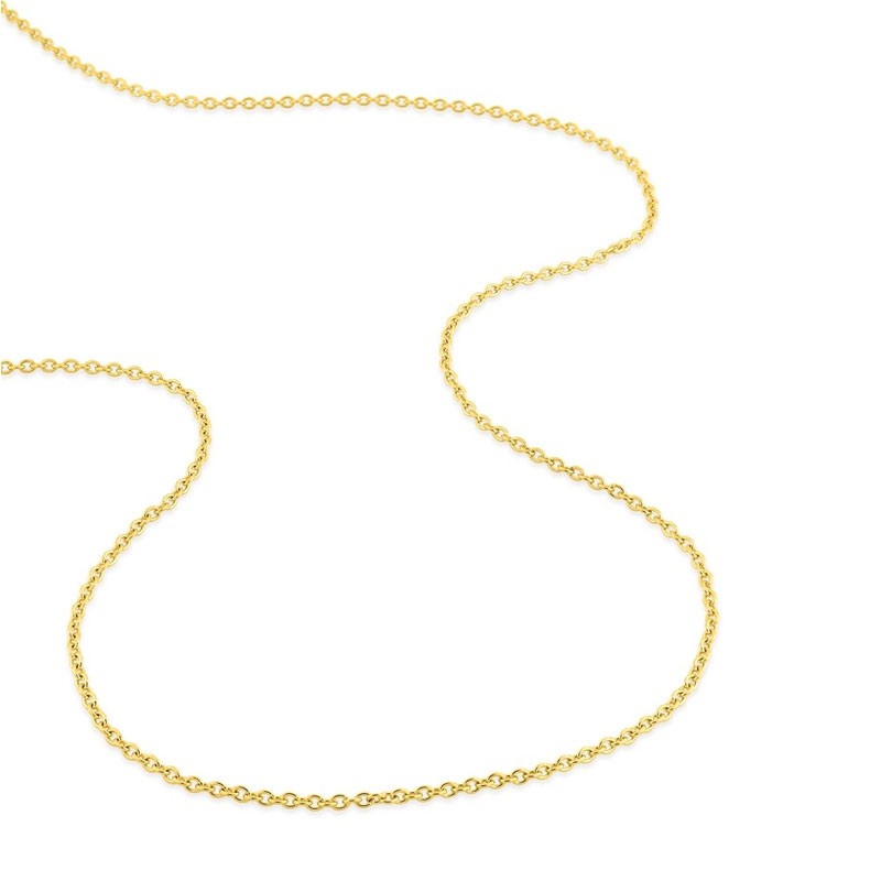 Cette chaîne est réalisée en or jaune 375 millièmes (9 carats), lui conférant une teinte solaire et précieuse. Le maillon de type forçat rond, d'une largeur de 1,64 mm, offre une texture lisse et une brillance classique qui s'adapte à tous les styles. Elle est légère avec un poids d'or théorique de 2,90 g pour une longueur de 40 cm.