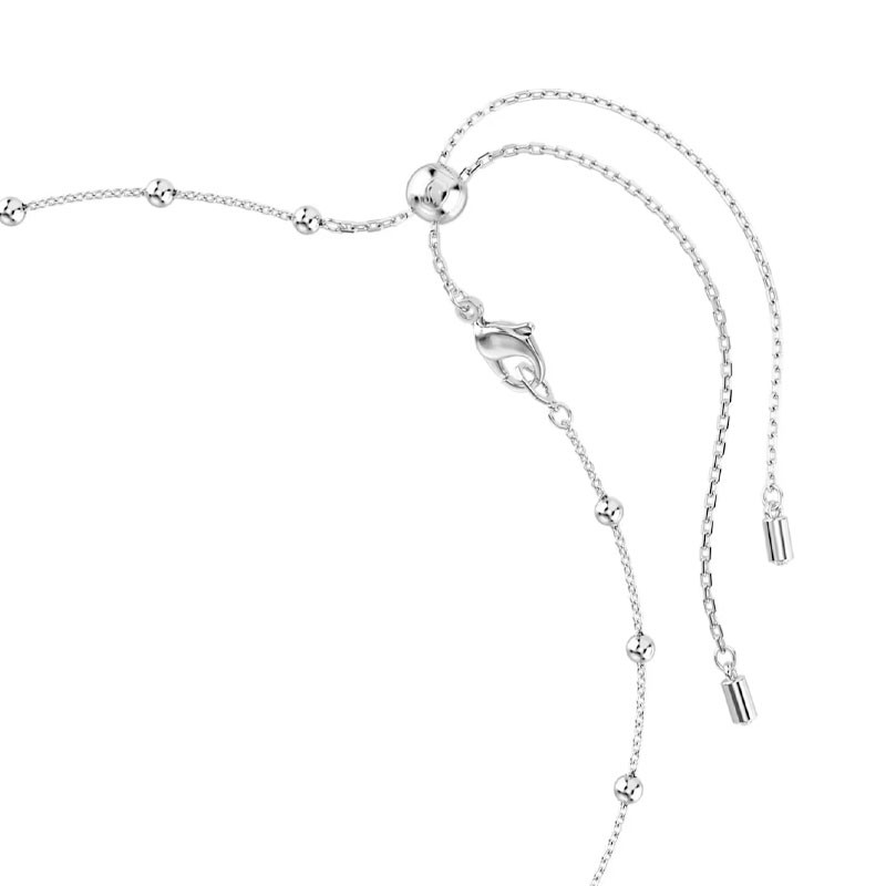 La chaîne en métal rhodié, assurant un éclat argenté durable, est équipée d'un mécanisme coulissant pour un ajustement parfait, variant de 38 cm à 48 cm. Elle est décorée de petites boules métalliques et d'un motif double face scintillant. En le retournant simplement, vous révélez un agencement différent de cristaux ronds, ajoutant une touche de créativité à votre parure. Le motif mesure 0,9 x 1,1 cm.