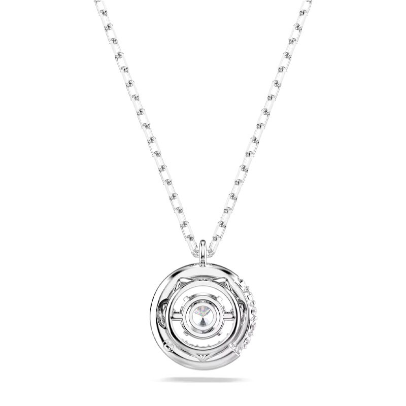Ce pendentif Dextera fascinant met en valeur la beauté du mouvement et de la géométrie. Il se distingue par un anneau central en métal rhodié, dont la moitié est incrustée d'un pavé de cristaux incolores, créant un élégant contraste de textures. Au centre, un Swarovski Zirconia dansant est placé pour un éclat continu et captivant.