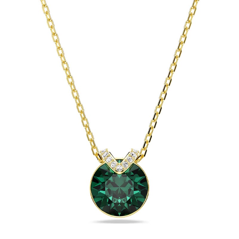 Ce pendentif de la collection Bella est un bijou fascinant qui attire tous les regards. Il se distingue par un grand cristal vert, intensément coloré et taillé avec précision, serti dans un élégant placage de ton or. Sa silhouette est rehaussée par un pavé scintillant en forme de V qui vient couronner la pierre.