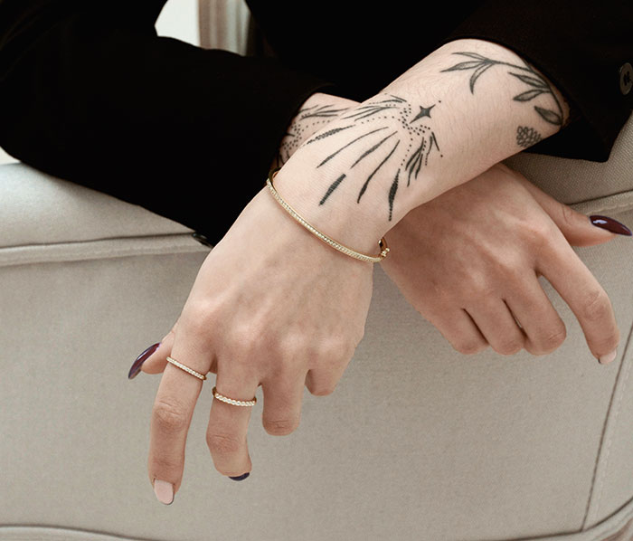 Certaines maisons, comme Les Georgettes, ont modernisé ce type de bracelet avec des systèmes personnalisables. Le principe repose sur une base rigide stable, dans laquelle on vient insérer un cuir coloré réversible et interchangeable. On garde la structure, on change le style. C’est exactement l’esprit actuel : un bijou durable, mais modulable. Parmi les catégories de bracelets, la manchette est celle qui transforme le plus une silhouette. Elle ne se porte pas pour se faire oublier. Elle se porte pour signer un look.