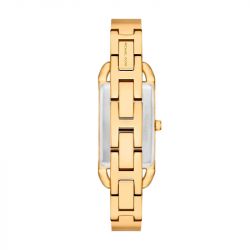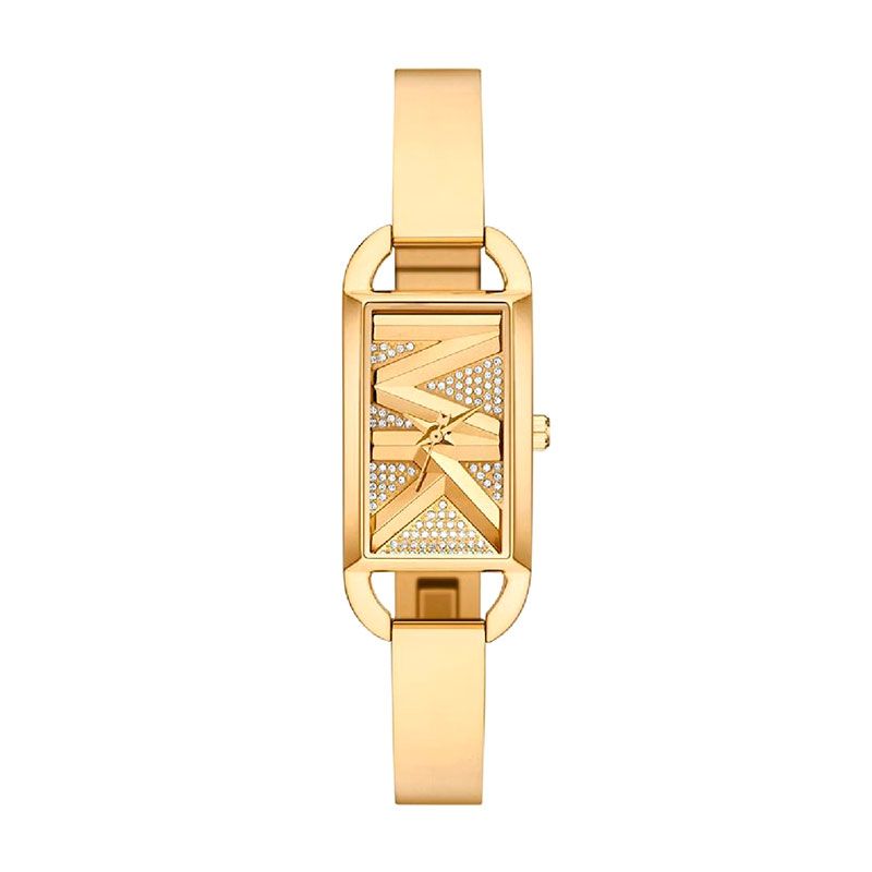 Capturant toute l’audace du style Michael Kors, la montre Empire MK4840 incarne le glamour contemporain dans une version bijou résolument tendance. Son boîtier rectangulaire allongé de 20 x 50 mm en acier inoxydable doré met en valeur un cadran spectaculaire orné de strass, dessinant les lettres « MK » dans un jeu graphique saisissant. Un design affirmé, renforcé par un affichage analogique minimaliste et des aiguilles dorées ton sur ton.