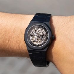 Audacieuse et raffinée, la MTBeta Skeleton Black Edition incarne l’équilibre parfait entre design technique et élégance urbaine. Son boîtier de 40 mm en acier inoxydable 316L, sublimé par un revêtement PVD noir, affiche des finitions brossées et polies qui renforcent sa silhouette moderne.