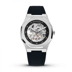 Le verre saphir, choisi pour sa résistance et sa clarté, protège un cadran architectural où chaque composant mécanique devient une œuvre à part entière. Le bracelet en silicone noir, souple et contemporain, apporte confort et caractère, renforcé par une boucle ardillon sobre et fonctionnelle.
