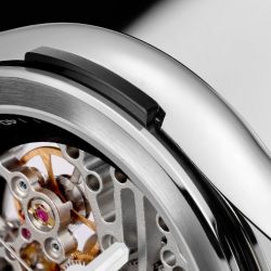 Son bracelet en silicone bleu, souple et texturé, contraste avec l’élégance technique du boîtier brossé et poli. Le verre saphir antirayure protège à la fois le cadran et le fond transparent, pour une vision nette du cœur battant de la montre. Étanche jusqu’à 10 ATM (100 mètres), elle vous accompagne avec fiabilité dans tous vos moments de vie.