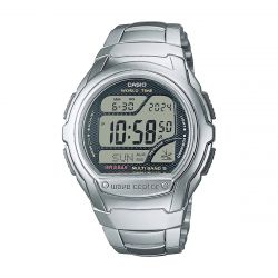 La Montre Homme Digitale CASIO WORLD TIME Acier Argenté WV-58RD-1AEF associe technologie et élégance avec son boîtier rond de 53,4 x 43,7 mm en résine et acier argenté. Son affichage digital, piloté par un mouvement Quartz, offre des fonctions multiples, notamment l'alarme quotidienne, l'illuminator, un calendrier automatique, ainsi qu'une fonction de chronométrage au 1/100e de seconde et des comptes à rebours. Dotée d’un récepteur de signaux radio pour ajuster l'heure (EU, USA, JPN), cette montre est parfaite pour les globe-trotters grâce à sa fonction heure universelle. Son bracelet en acier argenté ajoute une touche de raffinement, tout en garantissant robustesse et confort. Avec une étanchéité jusqu’à 5 ATM, elle s’adapte à toutes les situations. Un choix parfait pour s’offrir ou offrir une pièce fiable et élégante. Retrouvez la Montre Homme Digitale CASIO WORLD TIME sur votre bijouterie en ligne EDORA.
