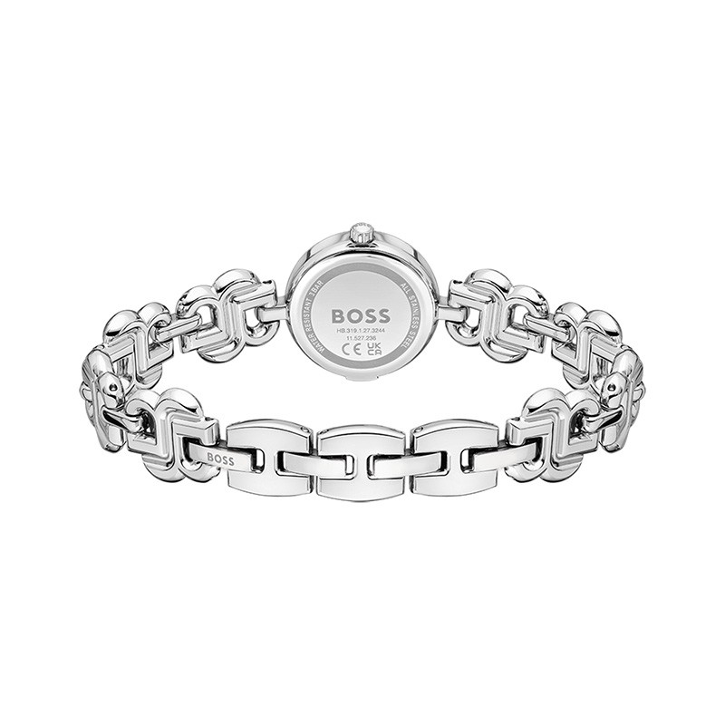 Son petit boîtier arrondi de 23 mm offre un cadran argenté épuré, orné de deux fines aiguilles qui glissent avec délicatesse dans une parfaite sobriété. Véritable signature stylistique, le bracelet en acier reprend le monogramme iconique BOSS dans une composition graphique et sophistiquée, faisant de cette montre un symbole d’élégance assumée.
