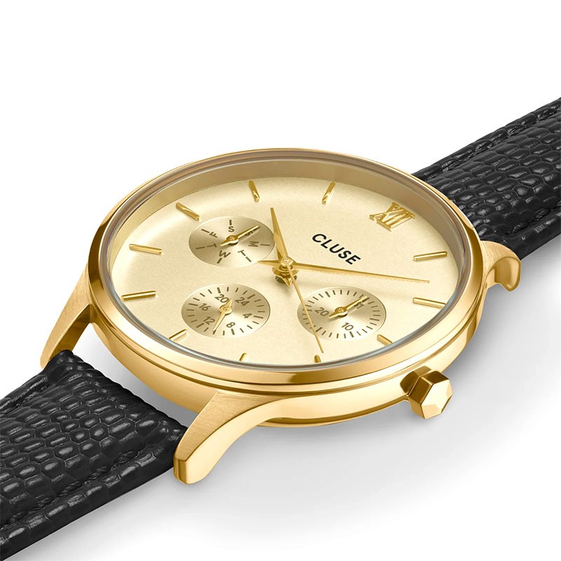 Élégante et racée, la montre Cluse Minuit Multifunction CW10705 sublime la sobriété du noir et l’éclat du doré dans un design résolument raffiné. Son boîtier rond de 34 mm en acier doré encadre un cadran doré satiné à trois compteurs, alliant fonction et esthétisme pour un look sophistiqué au quotidien.