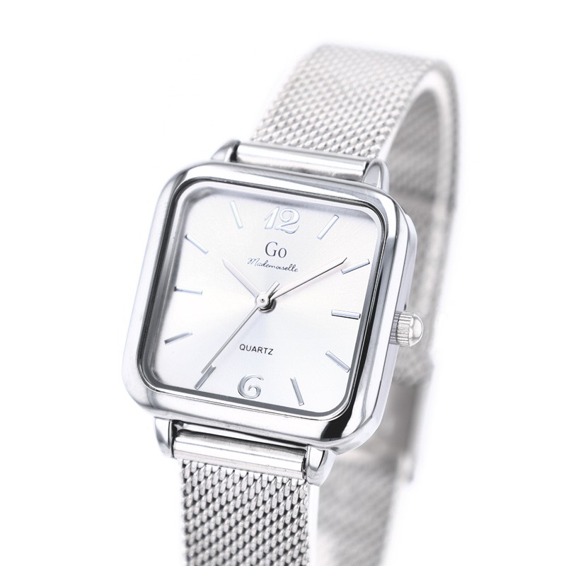 L’élégance s’exprime ici dans sa forme la plus contemporaine. Cette montre signée Go Mademoiselle séduit par son boîtier carré en acier argenté, adouci par des lignes arrondies, et son cadran blanc épuré souligné d’index fins et modernes. Une création au charme minimaliste, parfaite pour accompagner les femmes actives qui aiment conjuguer simplicité et sophistication.