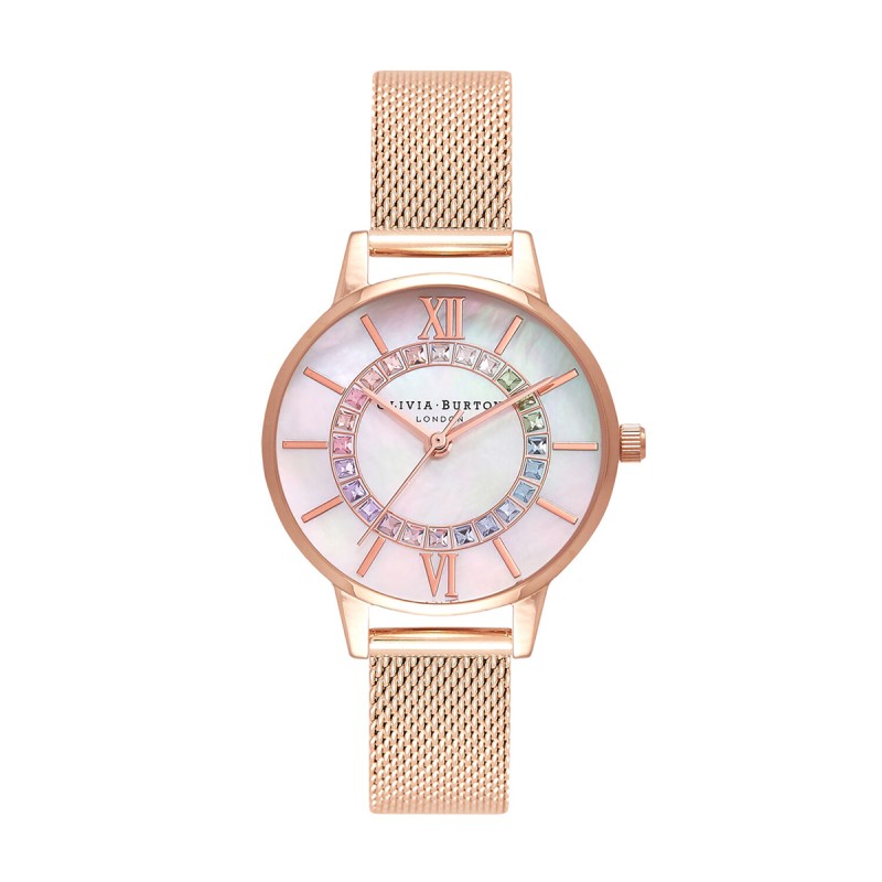 montre femme olivia burton Rainbow Sparkle Wonderland acier doré rose