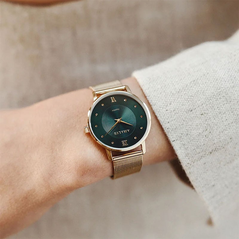 Audacieuse et raffinée, la montre Paulette séduit par son design contemporain et ses contrastes saisissants. Son large boîtier rond de 33 mm, en acier inoxydable 316L doré à l’or fin, encadre un somptueux cadran vert bleu aux reflets profonds et hypnotiques. Le motif en rayons de soleil gravé au centre capte subtilement la lumière à chaque mouvement du poignet, tandis que les index en zirconium scintillants rythment le pourtour avec délicatesse. Deux chiffres romains dorés (XII et VI) viennent ponctuer l’ensemble avec une touche de classicisme, parfaitement équilibrée par la modernité du reste du cadran.