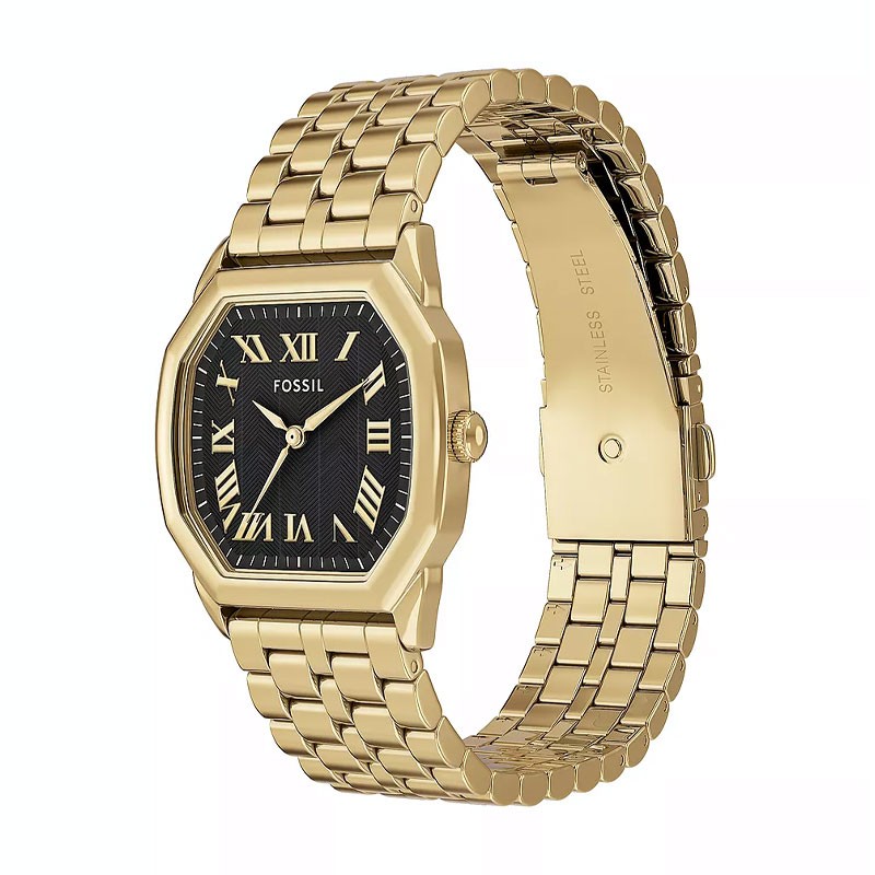 Le boîtier octogonal de 27 mm, en acier doré, encadre un cadran noir, dont la finition texturée apporte une profondeur et un contraste subtils. Les chiffres romains apportent une touche de classicisme, tandis que les trois aiguilles, fines et élégantes, marquent l'heure avec grâce. L'ensemble est protégé par un verre minéral résistant, assurant une protection optimale au quotidien.