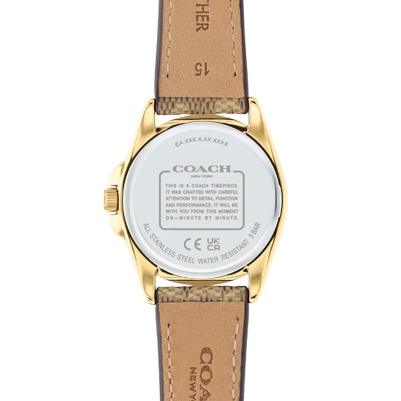 Son bracelet en cuir marron, d'une douceur et d'une robustesse inégalées, s'harmonise parfaitement avec le boîtier. Son motif signature de la marque Coach apporte une touche de sophistication supplémentaire. Il se ferme grâce à une boucle classique, assurant un maintien sûr et confortable. Avec une étanchéité de 3 ATM, cette montre résiste aux éclaboussures et à la pluie, mais il est conseillé de ne pas l'immerger.