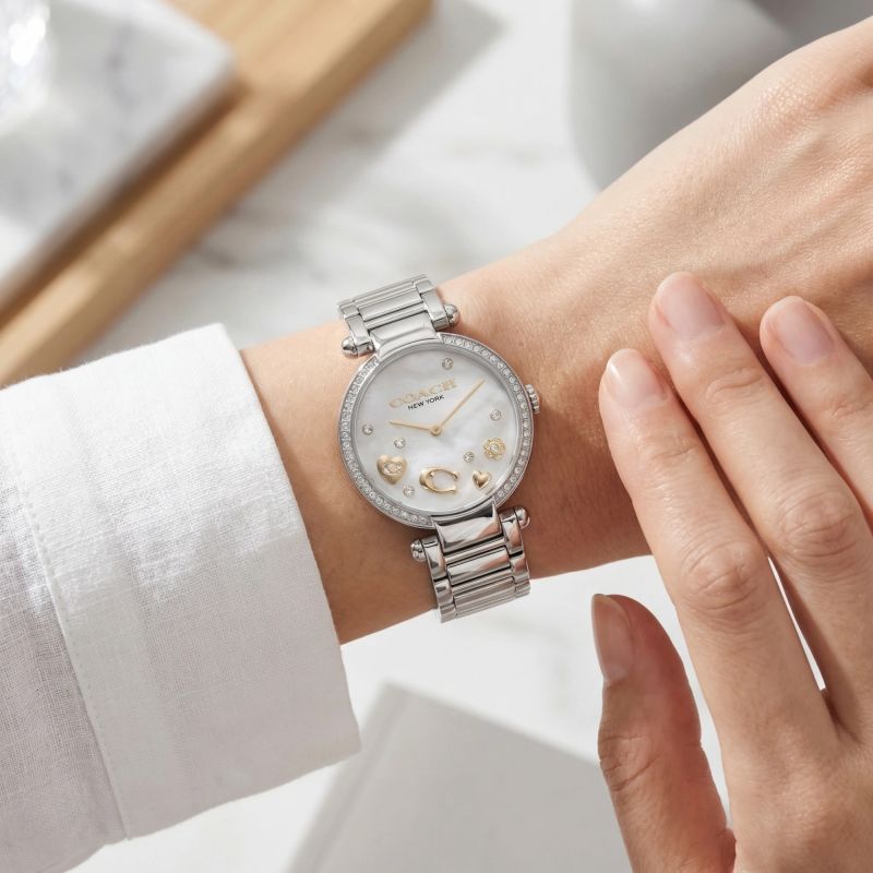 Le cœur de cette montre réside dans son cadran en nacre, dont les reflets irisés captent la lumière avec grâce. Le pourtour du boîtier est orné de deux rangées de cristaux scintillants, créant un effet de halo qui attire le regard. Les index sont subtilement remplacés par des charms dorés en forme de cœur, de fleur et de logo de la marque, ajoutant une touche de fantaisie chic. Animée par un mouvement à quartz précis, cette montre vous offre une fiabilité irréprochable au quotidien.