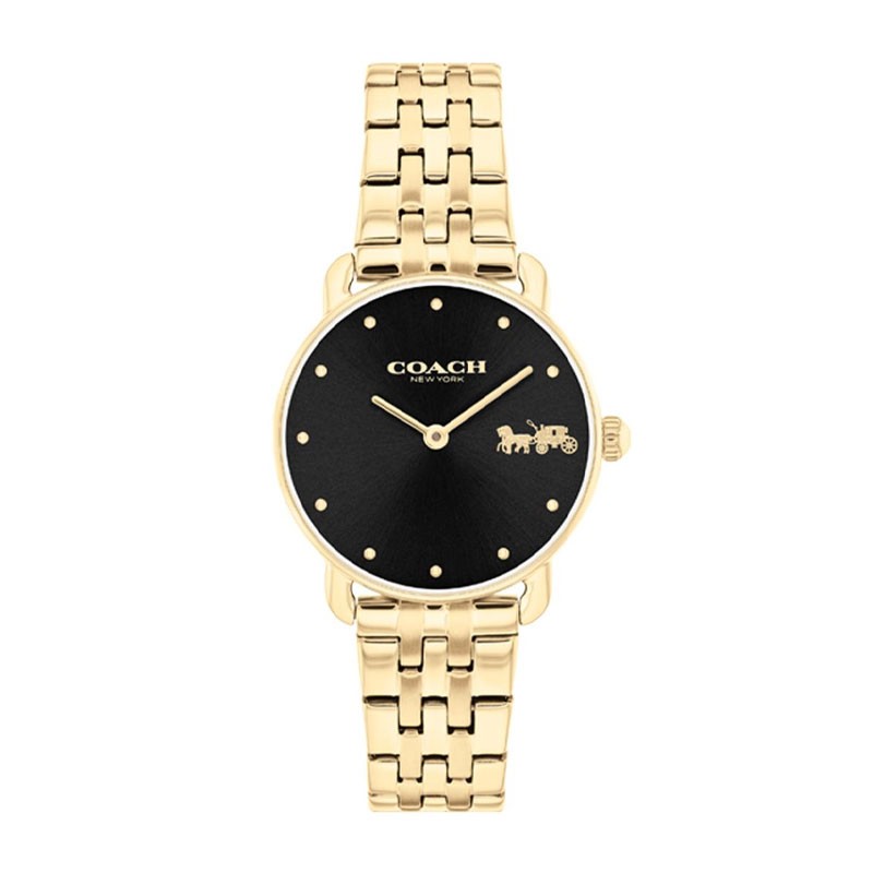 Fabriquée avec un boîtier rond de 28 mm en acier doré, cette montre est animée par un mouvement à quartz précis. Son cadran noir, minimaliste et élégant, est orné de petits points dorés et du logo emblématique de la marque, ajoutant une touche de luxe discret. Le bracelet en maillons d'acier doré se prolonge par une boucle déployante, à la fois sécurisée et confortable pour un porté quotidien.