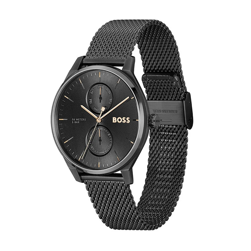 La Montre Homme BOSS TYLER NOIR Acier Noir se distingue par son allure moderne et son design monochrome, idéal pour l'homme contemporain qui recherche élégance et discrétion dans ses accessoires.