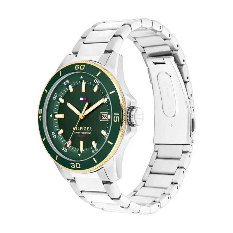 Le boîtier, avec son verre minéral résistant, s'harmonise parfaitement avec le bracelet en acier argenté. Ce dernier se ferme avec une boucle déployante, assurant un maintien sûr et confortable. Sa lunette verte, rehaussée de détails dorés, et son étanchéité de 5 ATM la rendent résistante aux éclaboussures et à la pluie, mais il est conseillé de ne pas l'immerger.