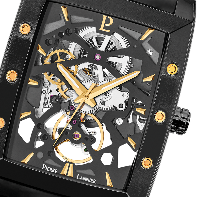 Le boîtier tonneau de 42.6 x 36.6 mm en acier inoxydable couleur noir offre une silhouette élégante et contemporaine. Il encadre un cadran transparent (squelette) qui révèle le mouvement automatique en action, une invitation à admirer le cœur battant de cette montre exceptionnelle. Le verre minéral surmontant le cadran garantit une protection et une clarté optimales pour cette fenêtre sur la mécanique de précision.