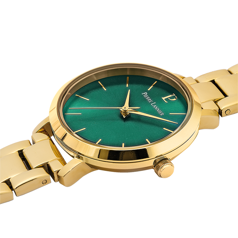 Découvrez le Coffret Montre Femme PIERRE LANNIER CHOUQUETTE Acier Doré et Cuir Vert, une fusion parfaite d'élégance et de fonctionnalité. Ce coffret exclusif comprend une montre avec un boîtier rond de 30mm en acier inoxydable couleur or et un cadran vert qui reflète un style classique et raffiné.