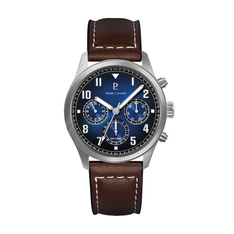 Montre Homme PIERRE LANNIER AVIATEUR Argenté Cadran Bleu Bracelet Cuir Brun 22 MM 257H164