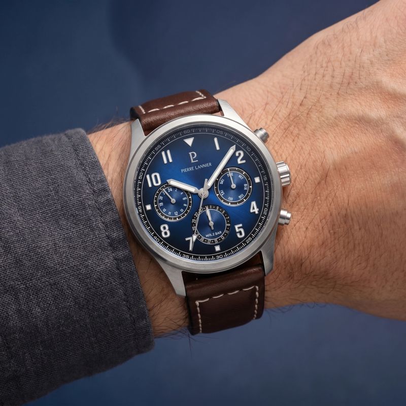 Son boîtier généreux de 42,5 mm en acier inoxydable argenté alterne les finitions mates et brillantes, conférant une présence masculine et technique au poignet. Le cadran bleu profond au fini soleillé fumé est structuré par une minuterie "chemin de fer" et accueille trois compteurs pratiques : le jour de la semaine, la date et un affichage 24 heures. Les index embossés et les aiguilles argentées assurent une lisibilité optimale, typique des instruments de bord d'aviation.