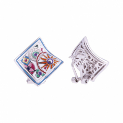 Laissez-vous envoûter par l’élégance graphique des boucles d’oreilles Pashmina de UNA STORIA, conçues en argent 925/1000 rhodié et sublimées par une palette de laques multicolores appliquées à la main. Inspirées des tissus précieux d’Orient, ces boucles prennent la forme de carrés légèrement galbés, dont le motif floral stylisé évoque à la fois un foulard en soie et une œuvre d’art miniature.