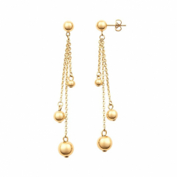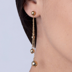 Entièrement réalisées en acier doré, ces boucles d'oreilles bénéficient de la robustesse et de la résistance de l'acier, assurant une belle tenue dans le temps. Avec un poids de 5,60 grammes, elles sont suffisamment légères pour être portées confortablement. Elles se composent de plusieurs chaînes fines de longueurs différentes, auxquelles sont suspendues des perles en acier de tailles variées, créant une texture riche et un mouvement dynamique. Le fermoir de type poussette garantit un maintien sûr.