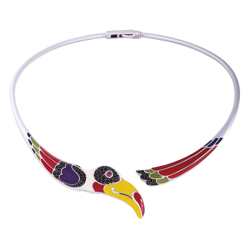 Collier Femme Toucan UNA STORIA Argent 925/1000 Laqué Multicolore et Oxydes CL12144, un bijou sculptural à la beauté flamboyante. Inspiré de l’exubérance tropicale, ce torque en argent 925/1000 rhodié magnifie l’élégance naturelle avec son motif toucan aux couleurs vives, rehaussé par des oxydes de zirconium qui apportent une brillance précieuse à l’ensemble.